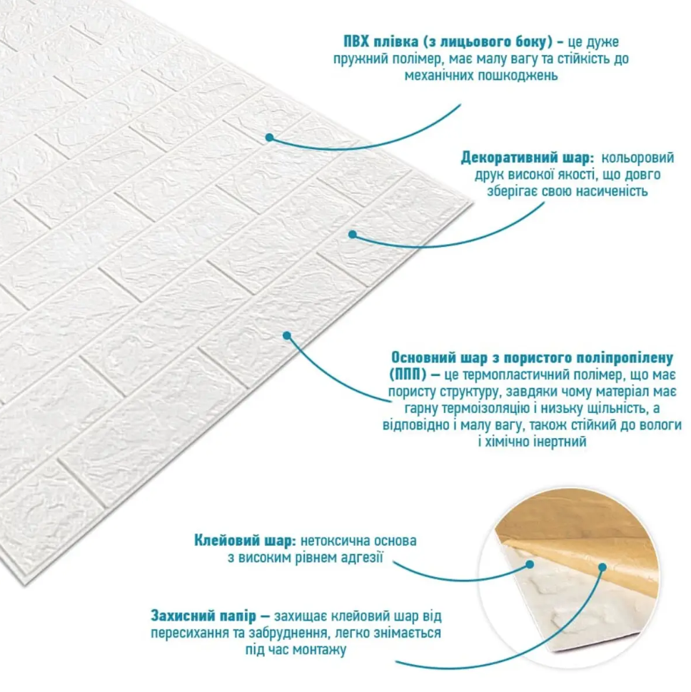 Самоклеюча 3D панель Sticker wall у рулоні 700мм*3,08м*2мм біла цегла R001-2 (D) SW-00002534 Декоративні 3D панелі, виготовлені на основі самоклеючого матеріалу зі спіненого поліпропілену. Мають тривалий термін служби, що перевищує 20 років. Розмір: 700мм*3,08м*2мм. Матеріал: Спінений поліпропілен Покриття: Лак Тип використання: Для внутрішніх робіт Переваги 3D панелей: - легкий монтаж; - підходять для використання на нерівних поверхнях; - якісний утеплювач; - має властивості шумоізоляції та вібропоглинання; - можна мити; - не вбирають вологу та бруд; - гіпоалергенні; - незаймистий матеріал; - м'які та безпечні для дітей; - не виділяють шкідливих випарів. Самоклеючі панелі з універсальним дизайном підходять для поклейки в приватному будинку та громадських місцях: квартира/будинок (кухня, санвузол, житлові кімнати, балкон, гардероб, передпокій), магазини, паби, кафе, шоу-руми, офіси, гаражі, дачі, ігрові зали. Монтаж: 1. Виміряти поверхню, що обклеюється; 2. Очистити стіну від пилу; 3. Зняти з панелі захисну плівку; 4. Приклеїти панель до стіни та щільно притиснути.Характеристики