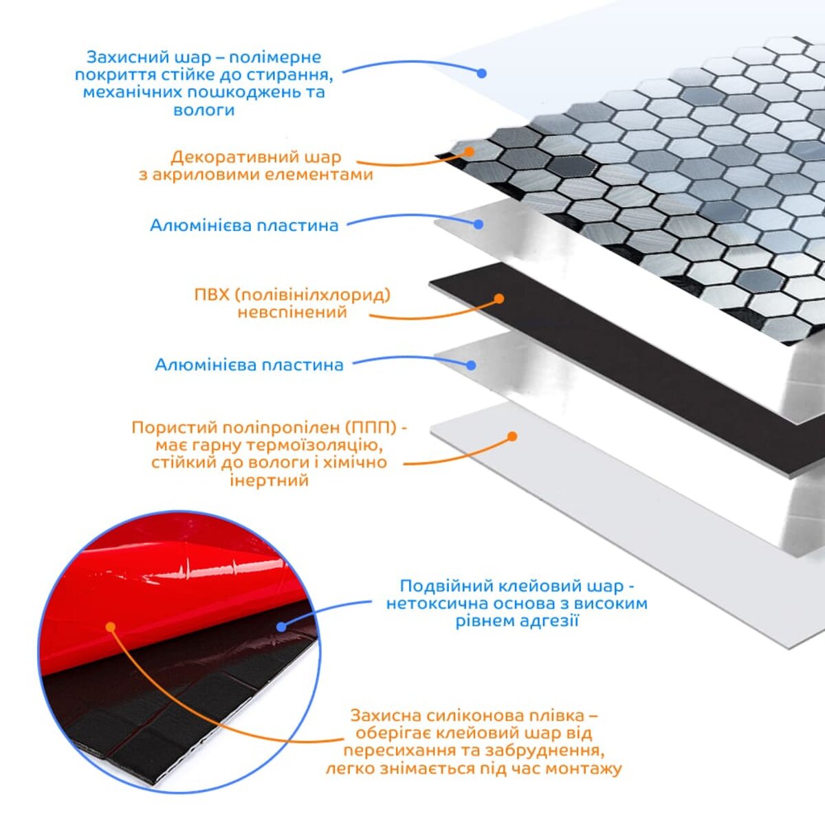 Самоклеюча алюмінієва плитка Sticker wall срібна мозаїка із дзеркальними вставками 300х300х3мм SW-00001928 (D) - це сучасний та практичний матеріал для обробки стін та інших поверхонь. Вона являє собою квадратні панелі розміром 300х300х3мм, виготовлені з алюмінію із захисним покриттям. На тильну сторону панелей нанесено клейову основу, що забезпечує простий та швидкий монтаж без використання додаткових інструментів. Розміри: 300х300х3мм. Вага: 1 плитка 200 грам. Фактура: досить гладка, але є візуальний ефект 3D, не глянець, невеликий блиск перламутровий. Переваги: 1. Легкий монтаж: Плитка легко наклеюється на будь-яку рівну поверхню, не вимагаючи попередньої підготовки. 2. Вологостійкість: Матеріал не боїться води та пари, тому підходить для використання у ванних кімнатах, кухнях та інших приміщеннях із підвищеною вологістю. 3. Довговічність: Алюмінієва плитка стійка до механічних пошкоджень, подряпин та вицвітання. 4. Гігієнічність: Поверхня плитки легко миється та не вбирає запахи. 5. Декоративність: Широкий вибір кольорів та фактур дозволяє створити стильний та неповторний інтер'єр. Застосування: Самоклеюча алюмінієва плитка Sticker Wall може використовуватися для обробки: - Стін на кухні, у ванній кімнаті, вітальні, спальні, передпокої та інших приміщеннях. - Фартух на кухні. - Меблеві фасади. - Декоративні елементи. Матеріал: 1. Захисний шар: - Полімерне покриття, стійке до стирання, подряпин та вологи. - Зберігає естетичний вигляд плитки. - Прозоре чи кольорове, з матовою поверхнею. 2. Алюмінієва пластина: - Забезпечує міцність та стійкість до деформації. - Особлива кристалічна структура для оптимальних характеристик. 3. ПВХ (полівінілхлорид): - Неспінений, з високою щільністю. - Твердий, стійкий до механічних впливів та високих температур. 4. Пористий поліпропілен (ППП): - Термопластичний полімер, легкий та гнучкий. - Забезпечує тепло- та звукоізоляцію. 5. Подвійний клейовий шар: - Нетоксичний, із високим рівнем адгезії. - Забезпечує надійне кріплення до різних поверхонь. 6. Захисний силіконізований папір: - Запобігає висиханню та забрудненням клейового шару. - Легко знімається перед монтажем. Перед монтажем: - Переконайтеся, що поверхня та плитка кімнатної температури. - Зніміть захисну плівку з плитки. Монтаж: 1. Почніть з одного кута. 2. Обережно притисніть плитку до поверхні. 3. Слідкуйте за рівністю, уникайте бульбашок та зморшок. 4. Підрізайте плитку за розміром будівельним ножем/ножицями. 5. Щільно притисніть плитку до поверхні. Рекомендації щодо догляду: - Не використовуйте абразивні щітки, мочалки та миючі засоби з високим вмістом лугів або кислот. - Уникайте води з високим вмістом солі. Розрахунок матеріалів: 1. Виміряйте довжину і висоту поверхні, що обклеюється. 2. Перемножте довжину та висоту кожної поверхні в метрах, щоб отримати площу. 3. Складіть площі всіх поверхонь. 4. Розділіть отриману площу на площу однієї плитки (0,09 кв.м) та округліть у велику сторону. 5. Додайте до отриманої кількості 2-3 плитки на запас. Приклад: - Довжина стіни: 2,2 м. - Висота стіни: 0,8м. - Площа стіни: 2,2 м*0,8 м = 1,76 кв.м. - Кількість плитки: 1,76 кв.м/0,09 кв.м = 19,55 (округлюємо до 20). - Запас: 2-3 плитки. - Разом: 22-23 плитки.Характеристики