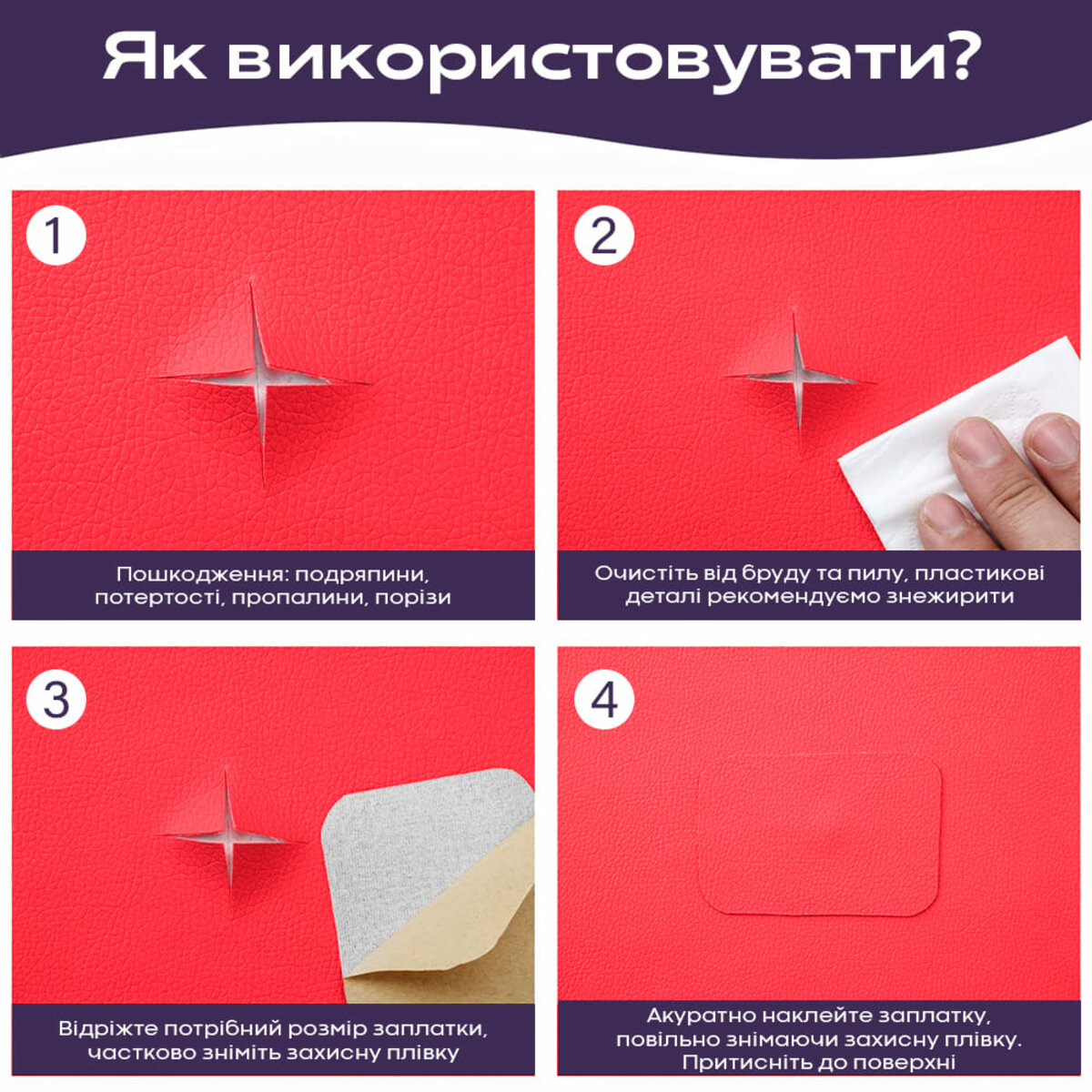 Самоклеюча екошкіра в рулоні Sticker wall 1.37*3m*0.5mm Червоний (D) SW-00002185 — це практичний та універсальний матеріал, який можна використовувати для оновлення меблів, дверей, автомобільних сидінь та інших предметів інтер'єру. Екошкіра має наступні переваги: - Стійка до механічних пошкоджень, вологи та забруднення. - Легко миється та чиститься. - Виготовляється із екологічно чистих матеріалів. Матеріал виробництва: PVC+PU (полівінілхлорид із поліуретановим покриттям). Розмір: 1.37 х 3м х 0.5 мм. Вага: 3м - 490 грам. Екошкіра – це синтетичний матеріал, який імітує натуральну шкіру. Вона має широкий асортимент кольорів, включаючи чорний, білий, бежевий, світло-коричневий, темно-коричневий, світло-сірий та темно-сірий. Структура екошкіри рельєфна та зерниста, що робить її схожою на натуральну шкіру. Екошкіра складається з чотирьох шарів: 1. Основа: полівінілхлорид (ПВХ) - це міцний та зносостійкий матеріал. 2. Захисне покриття: поліуретан - це міцний та водовідштовхувальний матеріал. 3. Клейовий шар: дозволяє надійно приклеїти вінілову шкіру до основи. 4. Захисний силіконізований папір: оберігає вінілову шкіру від пошкоджень при транспортуванні та зберіганні. Сфера застосування: - Ремонт дверей із пошкодженою кромкою. - Оббивка меблів. - Перетяжка стільців шкірою. - Ремонт салону автомобіля. - Оббивка сидінь мотоцикла. - Декорування стін. - Реставрація шкіряної сумки. - Відновлення шкіряного ременя. Основні властивості: 1. Простота у використанні: самоклеюча екошкіра не вимагає спеціальних інструментів і навичок для приклеювання. 2. Достатньо очистити поверхню та зняти захисну плівку. 3. Висока адгезія: матеріал надійно приклеюється до будь-яких поверхонь, навіть пористих і нерівних. 4. Імітує натуральну шкіру: екошкіра має рельєфну текстуру і тактильно схожа на натуральну шкіру. Переваги: - Економічність: самоклеюча екошкіра коштує дешевше натуральної шкіри. - Універсальність: матеріал можна використовувати для ремонту та декорування різних поверхонь. - Міцність: екошкіра більш міцна та довговічна, ніж натуральна шкіра. - Стійкість до зносу: екошкіра стійка до подряпин, деформацій та інших ушкоджень. - Стійкість до вологи та морозу: екошкіра не боїться води та низьких температур. - Екологічність: матеріал виготовляється без використання тваринної сировини. Інструкція із застосування матеріалу: Крок 1. Підготовка поверхні - Визначте ділянку поверхні, яку необхідно відновити. - Очистіть поверхню від бруду та пилу. - Для пластикових деталей рекомендується знежирити поверхню. Крок 2. Підготовка матеріалу - Підберіть відповідний розмір матеріалу. - Відріжте смугу матеріалу. - Частково зніміть шар захисту зі смуги матеріалу. Увага! Не знімайте повністю захисний шар, інакше екошкіра може приклеїтися до клейового шару і їх неможливо буде роз'єднати. Крок 3. Наклеювання матеріалу - Акуратно приклейте смугу матеріалу до поверхні, що реставрується. - Щільно притисніть матеріал до поверхні.Характеристики