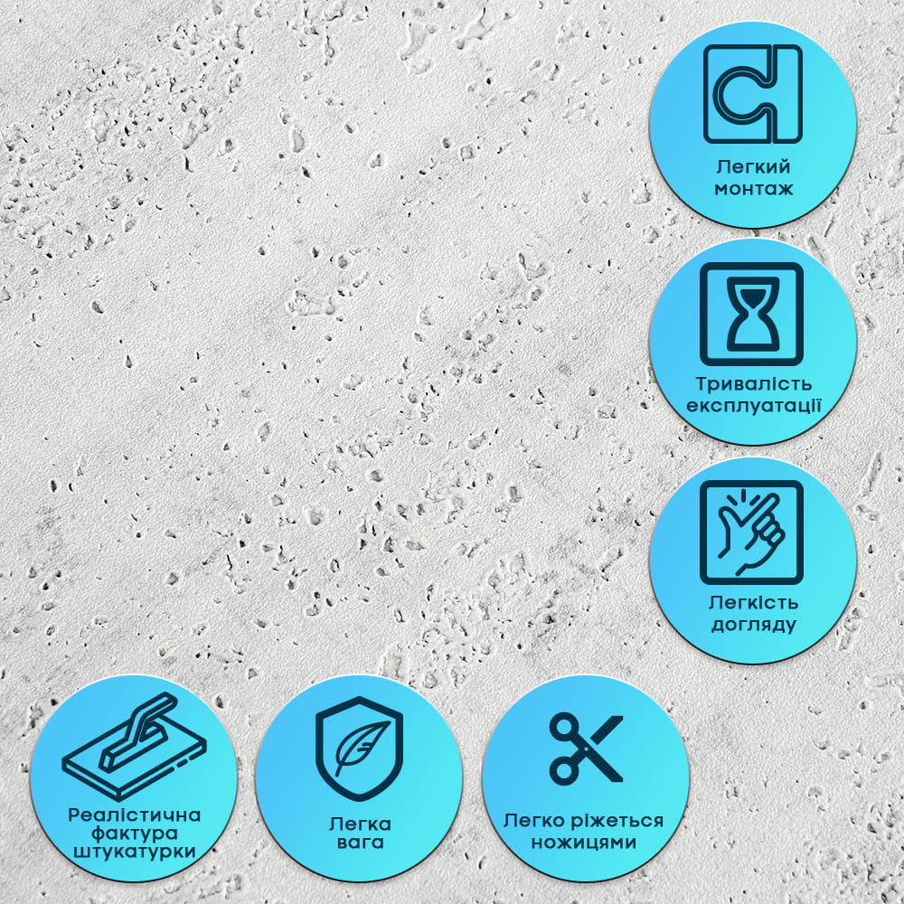 Набрид класичний ремонт, але хочеться преміального вигляду декоративної штукатурки? Відкрийте для себе самоклеючу гнучку штукатурку — інноваційне настінне покриття, яке поєднує вишуканий візуальний ефект оштукатуреної стіни та неперевершену простоту монтажу. Це рішення для тих, хто цінує швидкість, чистоту та ідеальну якість без компромісів. Самоклеюча гнучка штукатурка — інноваційне настінне покриття, яке візуально не відрізняється від справжньої декоративної штукатурки, але має значно ширші можливості у використанні. Завдяки еластичній структурі матеріал легко адаптується до будь-яких поверхонь, не утворює заломів і тріщин навіть під час монтажу на нерівних або складних ділянках. Покриття зберігає ідеальний вигляд без додаткових інструментів чи «брудних» робіт. Це універсальне рішення для швидкого, чистого та ефектного оздоблення стін, яке поєднує преміальний вигляд декоративної штукатурки з максимально простою технологією самоклеючого монтажу. Розмір: 600x600х2,5 мм Вага: 600x600мм – 250 грам Площа покриття: 600х600мм – 0,36 кв.м Переваги самоклеючої гнучкої штукатурки 1. Еластичність та гнучкість - забудьте про заломи! Завдяки унікальній еластичності та вбудованій армувальній сітці, матеріал ідеально лягає навіть на нерівні або складні ділянки, зберігаючи стабільну геометрію та форму. 2. Самоклеючий монтаж - ніякого клею, бруду та очікування. Подвійний клейовий шар із високою адгезією гарантує миттєве та надійне встановлення. Просто зніміть захисну плівку та приклейте! 3. Стійкість до вологи (навіть для ванних!) - матеріал не вбирає воду, стійкий до пари та не сприяє плісняві. Ідеально підходить для кухонь та ванних кімнат. 4. Довговічність та міцність - комбінація міцного ПВХ шару та армувальної сітки забезпечує стійкість до зносу. Покриття не тріскається та не кришиться навіть при активній експлуатації. 5. Додатковий комфорт - основа з ХРЕ та фольгований шар забезпечують помірні тепло- та звукоізоляційні властивості, роблячи ваше приміщення затишнішим. 6. Простий догляд - легко очищується вологою серветкою. А якщо пошкодиться одна плитка — її можна швидко замінити, не демонтуючи всю поверхню. 7. Безпека - виготовлений із нетоксичної та екологічно безпечної сировини, підходить для будь-яких житлових приміщень. Властивості матеріалу Кожна плитка розміром 600x600x2,5 мм (площа покриття 0,36 кв. м) — це багатошарова конструкція, розроблена для максимальної надійності та візуального ефекту. 1. Пігментований ПВХ шар (декоративний): максимально детальна фактура, що імітує декоративну штукатурку. Стійкий до УФ та хімічних речовин, здатний відновлювати форму після деформації. 2. Армувальна сітка: внутрішнє зміцнення. Запобігає розтягуванню та деформаціям, гарантуючи стабільність форми. 3. ХРЕ (спінений поліетилен): легка, пружна та вологостійка основа із закритою комірчастою структурою. Забезпечує пружність та теплоізоляцію. 4. Фольгований шар: подвійний захист! Відбиває теплові хвилі (додаткова теплоізоляція) та захищає від вологи, зміцнюючи ХРЕ-основу. 5. Подвійний клейовий шар: високоадгезійна, нетоксична основа для миттєвого монтажу. 6. Захисна фольгована плівка: оберігає клей, легко знімається під час роботи. Сфери застосування Цей універсальний матеріал ідеально підходить для внутрішніх оздоблювальних робіт у будь-якому приміще