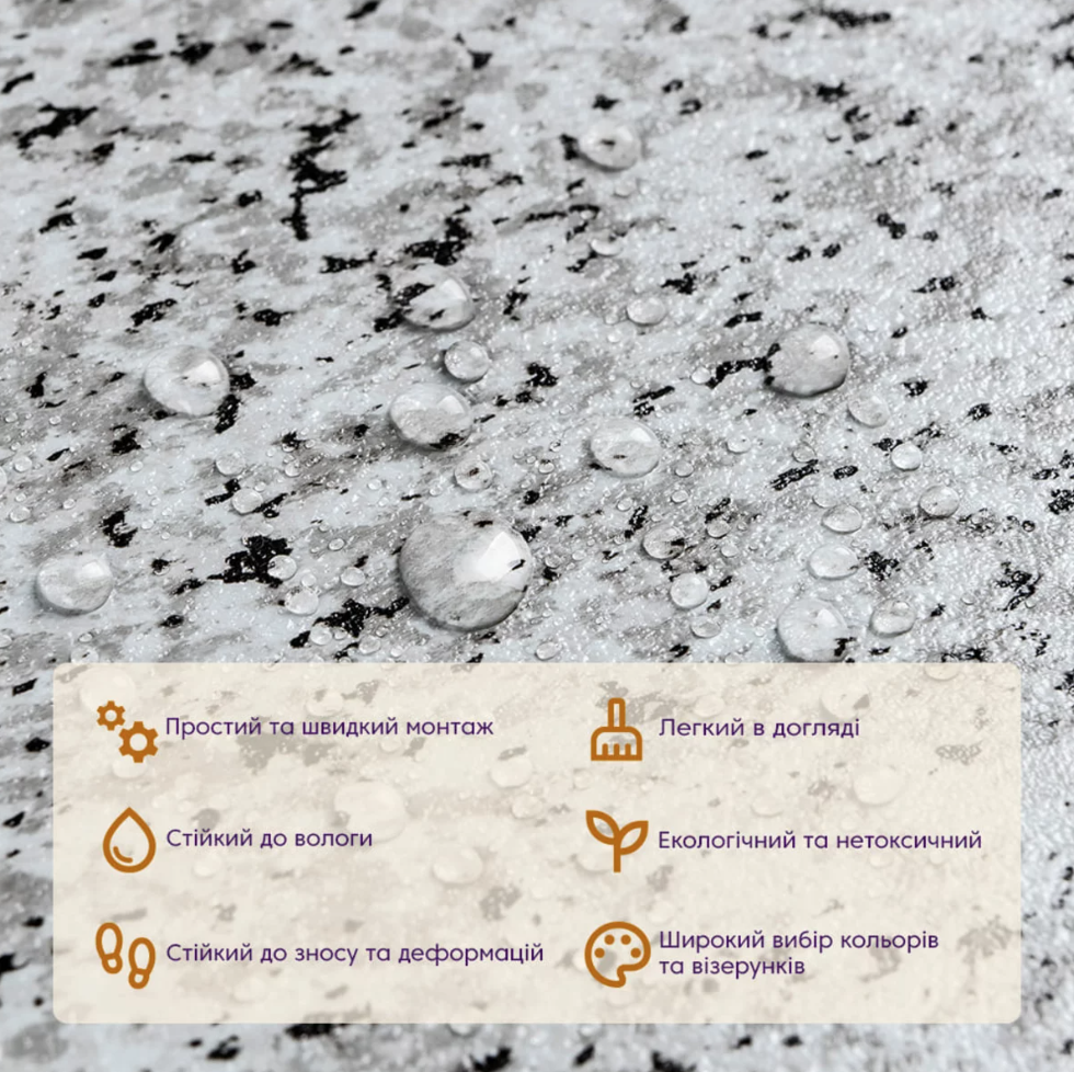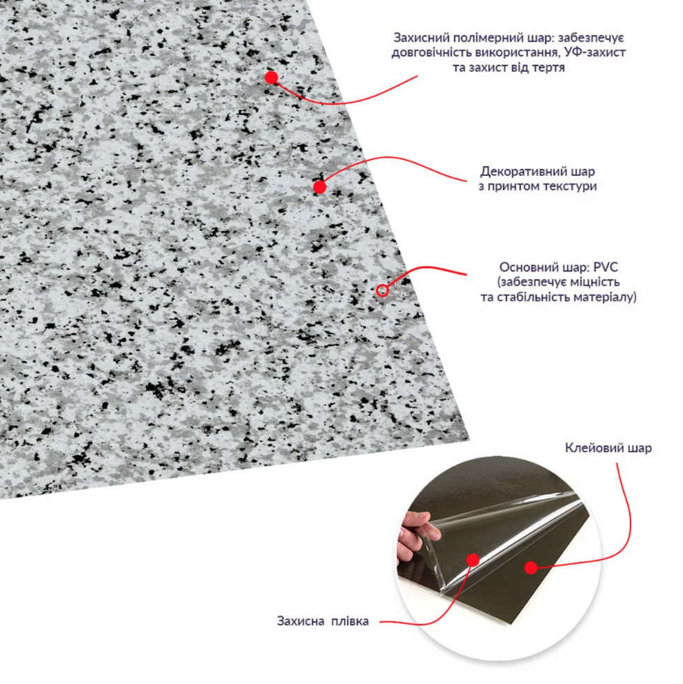 Самоклеюча LVT плитка Sticker wall 457*457*1.5mm (D) SW-00002464 Підлогове покриття LVT з самоклеючим шаром – багатошарове вінілове покриття, виготовлене методом гарячого пресування. Основою для нього є полівінілхлорид, який поєднується з різними пластифікаторами та стабілізаторами. Завдяки передовим технологіям друку та тиснення, це покриття має чудову візуальну схожість з натуральними матеріалами, ідеально імітуючи текстуру, кольори та зовнішній вигляд дерева, каменю, мармуру та інших природних матеріалів. Крім того, воно має високу вологостійкість, зносостійкість і легкість монтажу. Матеріал виготовлення – полівінілхлорид (PVC). Розмір – 457x457x1.5 мм. Вага однієї плитки – 550 грам. Текстура матеріалу може бути гладкою, глянцевою, матовою або напівматовою. Структура матеріалу включає такі шари: 1. УФ-покриття. 2. Захисний шар: Полімерний шар, що забезпечує стійкість та захист від стирання. 3. Декоративний шар: Тонка плівка з кольоровим друком, що повністю передає текстуру та візерунки дерева, каменю, мармуру та інших матеріалів. 4. Основний шар: Полівінілхлорид (PVC), що надає матеріалу міцність та стабільність. Нижній шар: 1. Клейовий шар: Екологічно безпечна основа з високою клейовою здатністю. 2. Захисний силіконізований папір. Застосування: Цей матеріал ідеально підходить для оздоблювальних робіт у різних комерційних та домашніх приміщеннях, включаючи офіси, житлові приміщення, кухні та ванні кімнати, а також для використання у громадських та медичних закладах, фітнес-центрах та готелях. Завдяки своїй вологостійкості, стійкості до забруднення та легкого догляду, він підходить для застосування в спальнях, вітальнях, кухнях, ванних кімнатах та на сходах. Може бути використаний як самостійне покриття для підлоги, для декоративних цілей або для оновлення старих покриттів. Особливості та переваги матеріалу: - Просте та швидке самоклейне кріплення, що не вимагає участі фахівців та спеціальних інструментів. - Реалістична імітація природних матеріалів із унікальним реалізмом. - Економія часу та зусиль при встановленні. - Пластичність та легкість обрізки. - Міцність та довговічність. - Опір зносу, вологи та морозу. - Ефективна шумо та теплоізоляція. - Зручність догляду та різноманітність кольорів та текстур. - Екологічна безпека. Монтаж: 1. Визначте площу, яку потрібно покрити. 2. Підготуйте поверхню: переконайтеся, що вона суха, рівна та чиста. 3. Приклеюйте плити, поступово знімаючи захисний шар паперу. 4. Ретельно притискайте плити до підлоги, щоб забезпечити надійне кріплення. 5. Укладайте плити з ретельним вирівнюванням стик до стику.Характеристики