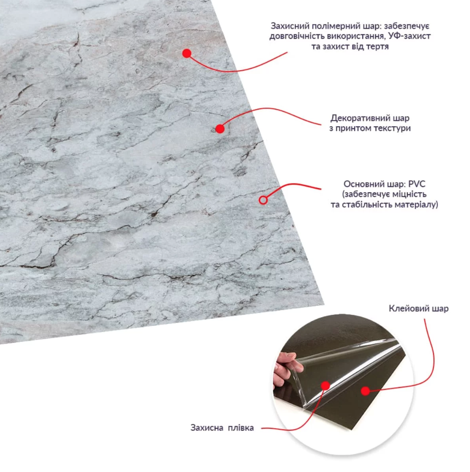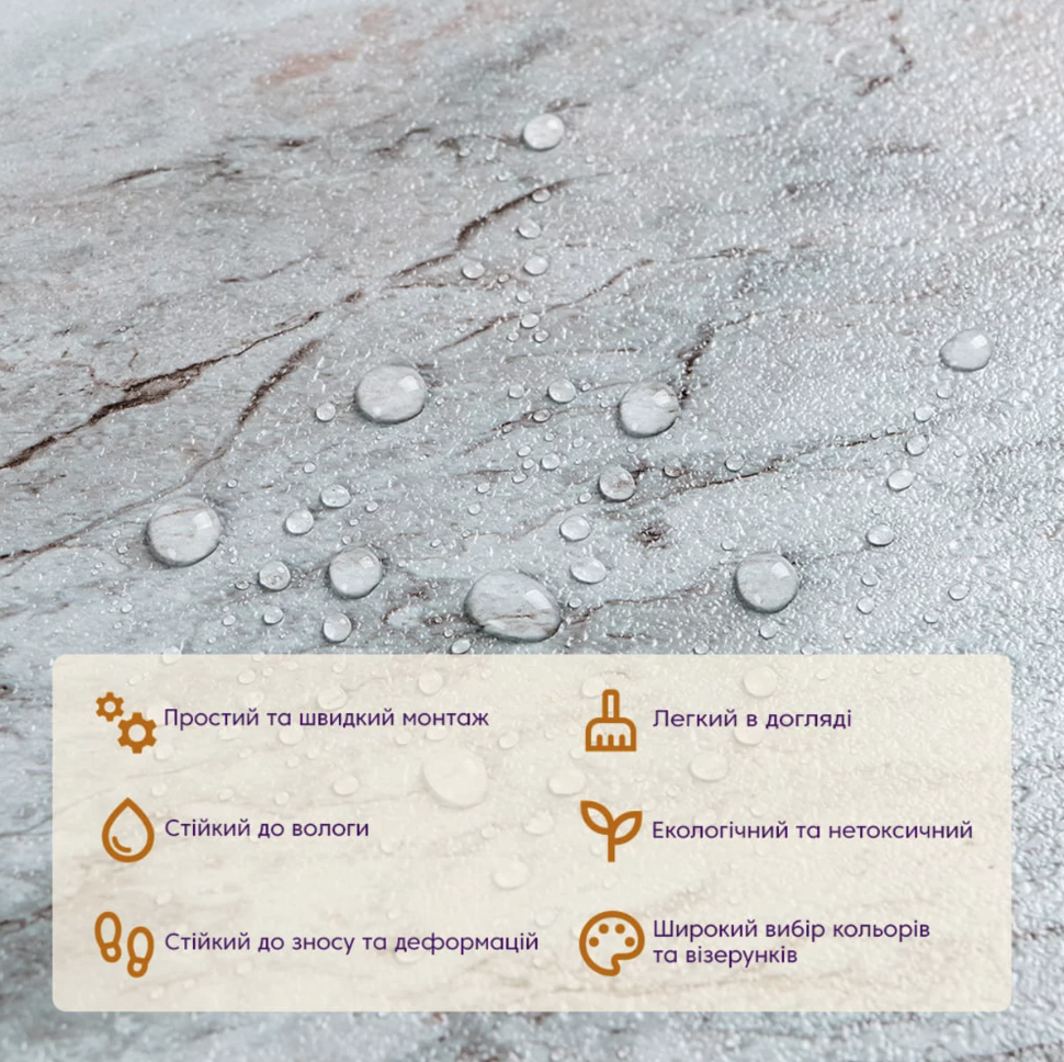 Самоклеюча LVT плитка Sticker wall 457*457*1.5mm (D) SW-00002465 Підлогове покриття LVT з самоклеючим шаром – багатошарове вінілове покриття, виготовлене методом гарячого пресування. Основою для нього є полівінілхлорид, який поєднується з різними пластифікаторами та стабілізаторами. Завдяки передовим технологіям друку та тиснення, це покриття має чудову візуальну схожість з натуральними матеріалами, ідеально імітуючи текстуру, кольори та зовнішній вигляд дерева, каменю, мармуру та інших природних матеріалів. Крім того, воно має високу вологостійкість, зносостійкість і легкість монтажу. Матеріал виготовлення – полівінілхлорид (PVC). Розмір – 457x457x1.5 мм. Вага однієї плитки – 550 грам. Текстура матеріалу може бути гладкою, глянцевою, матовою або напівматовою. Структура матеріалу включає такі шари: 1. УФ-покриття. 2. Захисний шар: Полімерний шар, що забезпечує стійкість та захист від стирання. 3. Декоративний шар: Тонка плівка з кольоровим друком, що повністю передає текстуру та візерунки дерева, каменю, мармуру та інших матеріалів. 4. Основний шар: Полівінілхлорид (PVC), що надає матеріалу міцність та стабільність. Нижній шар: 1. Клейовий шар: Екологічно безпечна основа з високою клейовою здатністю. 2. Захисний силіконізований папір. Застосування: Цей матеріал ідеально підходить для оздоблювальних робіт у різних комерційних та домашніх приміщеннях, включаючи офіси, житлові приміщення, кухні та ванні кімнати, а також для використання у громадських та медичних закладах, фітнес-центрах та готелях. Завдяки своїй вологостійкості, стійкості до забруднення та легкого догляду, він підходить для застосування в спальнях, вітальнях, кухнях, ванних кімнатах та на сходах. Може бути використаний як самостійне покриття для підлоги, для декоративних цілей або для оновлення старих покриттів. Особливості та переваги матеріалу: - Просте та швидке самоклейне кріплення, що не вимагає участі фахівців та спеціальних інструментів. - Реалістична імітація природних матеріалів із унікальним реалізмом. - Економія часу та зусиль при встановленні. - Пластичність та легкість обрізки. - Міцність та довговічність. - Опір зносу, вологи та морозу. - Ефективна шумо та теплоізоляція. - Зручність догляду та різноманітність кольорів та текстур. - Екологічна безпека. Монтаж: 1. Визначте площу, яку потрібно покрити. 2. Підготуйте поверхню: переконайтеся, що вона суха, рівна та чиста. 3. Приклеюйте плити, поступово знімаючи захисний шар паперу. 4. Ретельно притискайте плити до підлоги, щоб забезпечити надійне кріплення. 5. Укладайте плити з ретельним вирівнюванням стик до стику.Характеристики