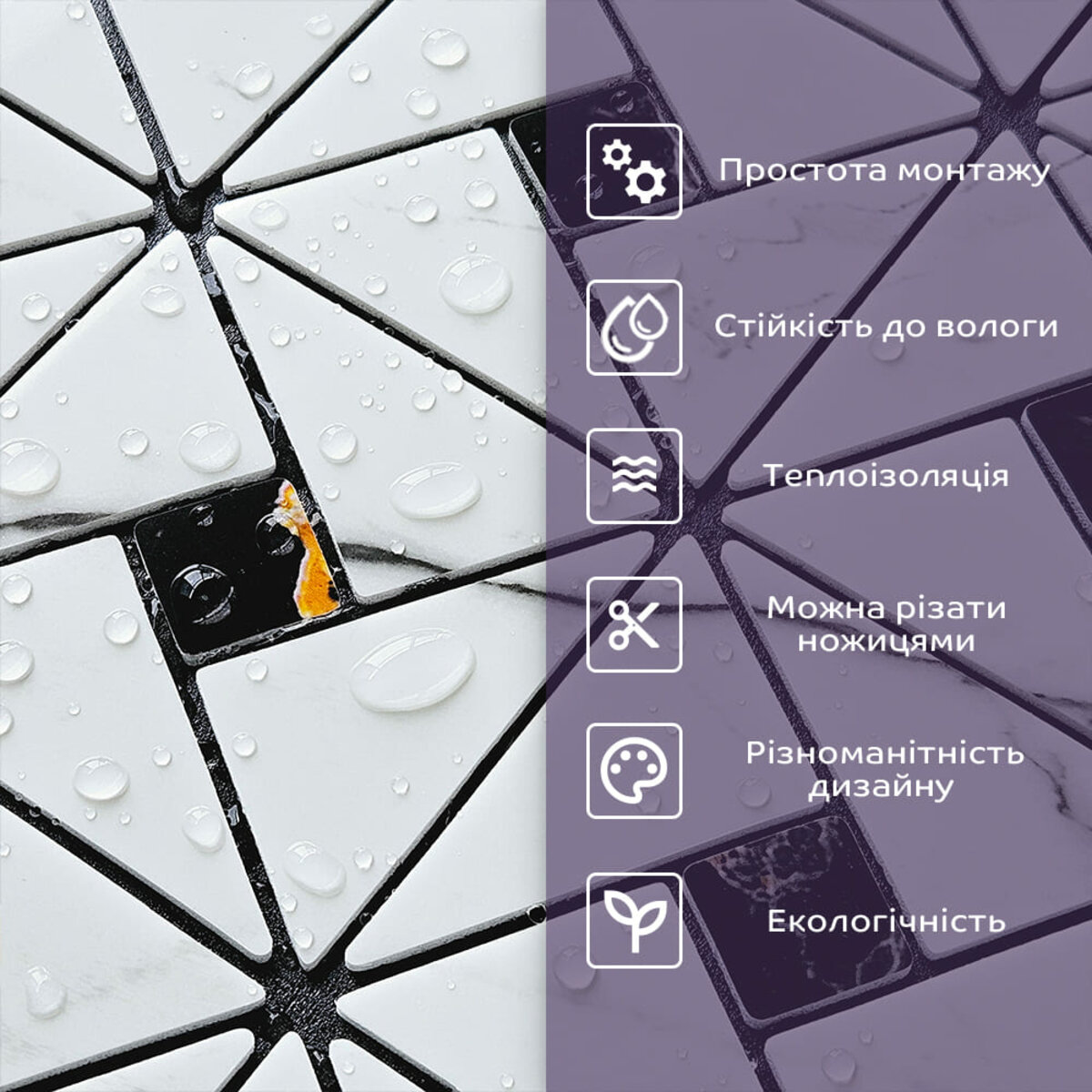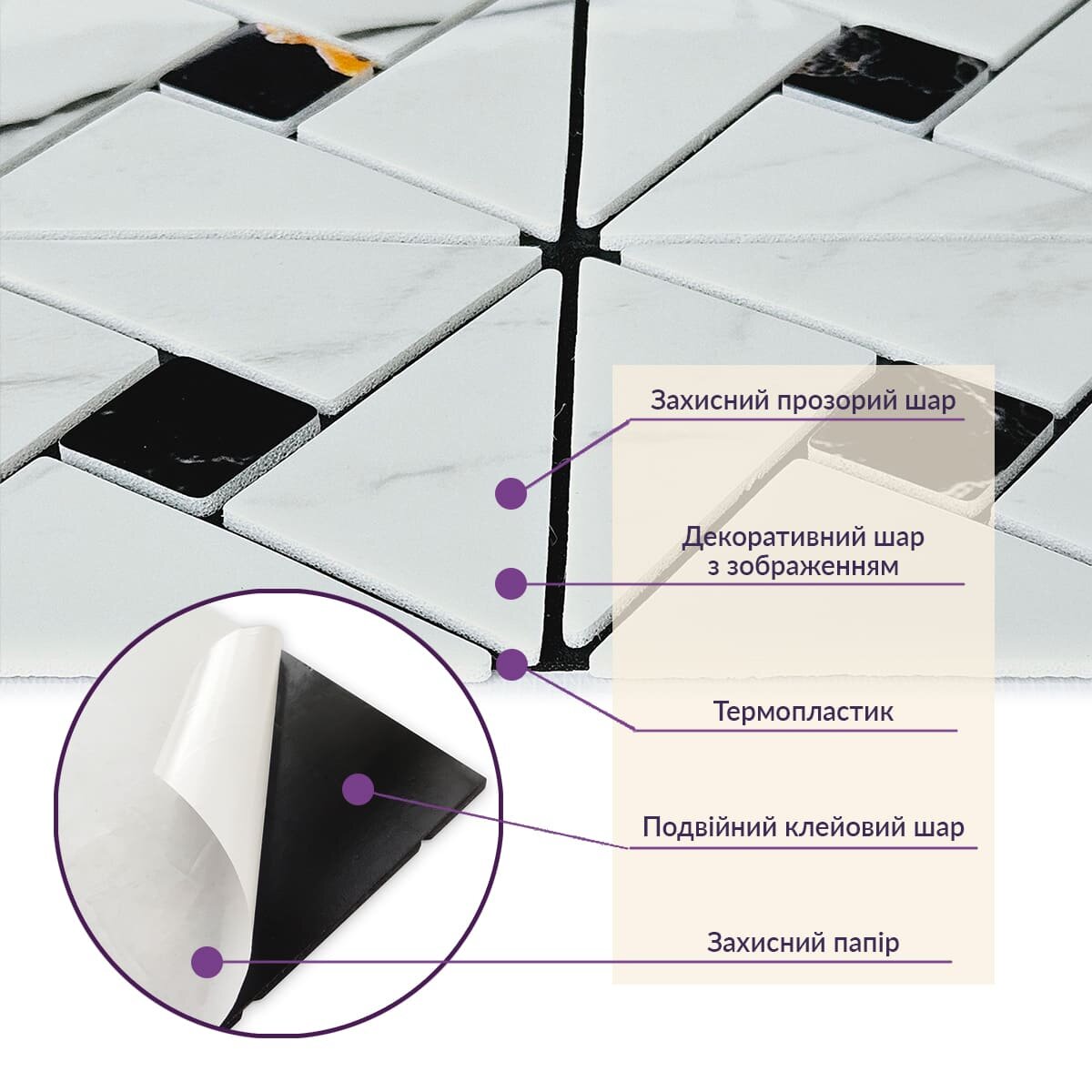 Самоклеюча PET мозаїка Sticker wall 30*30см*4мм (D) SW-00002447 Сучасний дизайн з плиткою з ПЕТ: легкість, міцність та стиль Плитка з поліетилентерефталату (ПЕТ) – це інноваційний матеріал, який відкриває нові можливості для створення стильних інтер'єрів. Завдяки своїй легкості, міцності та екологічності, вона стає ідеальним вибором для декорування житлових і комерційних приміщень. ПЕТ-плитка дозволяє реалізувати найсміливіші дизайнерські ідеї: від елегантних мозаїчних візерунків до оригінальних художніх інсталяцій. Цей матеріал відмінно підходить для оздоблення стін, меблів, дверей та інших поверхонь, створюючи сучасний та функціональний вигляд. Його універсальність, простота монтажу та довговічність роблять ПЕТ-плитку незамінним рішенням для будь-якого інтер'єру. Основні характеристики: Матеріал: ПЕТ (поліетилентерефталат). Розмір: 30см x 30см x 4мм. Вага: 75 грам. Площа покриття: 1 плитка = 0,09 кв.м; для 1 кв.м потрібно 12 одиниць. Фактура: рівна, з поглибленнями між мозаїчними елементами. Шари: - Захисний прозорий шар. - Декоративний шар із зображенням. - Термопластик. - Подвійний клейовий шар. - Захисний папір. Температурний режим: від -40°C до +75°C. Призначення: ПЕТ-плитка ідеально підходить для внутрішніх оздоблювальних робіт. Вона використовується для декорування стін у житлових приміщеннях (кухня, ванна кімната, вітальня, спальня, вхідна група), а також у комерційних об'єктах. Матеріал також застосовується для оздоблення меблів, дверей та створення декоративних елементів. Переваги ПЕТ-плитки: 1. Легкість та міцність: матеріал легкий, простий у монтажі та довговічний. Плитку можна різати ножицями або монтажним ножем, що робить процес установки швидким і зручним. 2. Стійкість до вологи: ПЕТ-плитка не боїться вологи, пари та плісняви, що робить її ідеальним вибором для кухонь, ванних кімнат та інших приміщень з підвищеною вологістю. 3. Ізоляційні властивості: завдяки повітряним прошаркам матеріал забезпечує звукову та теплоізоляцію. 4. Антистатичний ефект: поверхня не притягує пил, що полегшує догляд за нею. 5. Різноманітність дизайну: широкий вибір кольорів, текстур та принтів дозволяє створювати унікальні інтер'єри. 6. Екологічність: ПЕТ-плитка може бути перероблена, що робить її екологічно чистим варіантом. 7. Простота в догляді: поверхня легко миється та не вимагає спеціальних засобів для чищення. 8. Довговічність: термін служби плитки становить від 5 років і більше. Інструкція з монтажу: 1. Підготовка поверхні: Переконайтеся, що поверхня чиста, суха та рівна. Видаліть пил, бруд та олію. Плитка та поверхня повинні бути кімнатної температури для кращого зчеплення. 2. Зняття захисного шару: Зніміть захисну плівку зі зворотного боку плитки, щоб відкрити клейку поверхню. 3. Початок монтажу: Розпочніть установку з кута, акуратно притискаючи плитку до поверхні. Стежте за тим, щоб плитка лягала рівно, без бульбашок або зморшок. 4. Підгонка за розміром: Використовуйте ніж або ножиці для підрізання плитки, особливо по краях та в кутах. 5. Фіксація: Щільно притискайте плитку до поверхні, щоб забезпечити міцне зчеплення. Чому варто обрати ПЕТ-плитку? ПЕТ-плитка – це сучасне рішення для тих, хто цінує стиль, практичність та екологічність. Вона поєднує в собі легкість монтажу, довговічність та естетичний вигляд, що робить її ідеальним вибором для будь-якого інтер'єру. Ств