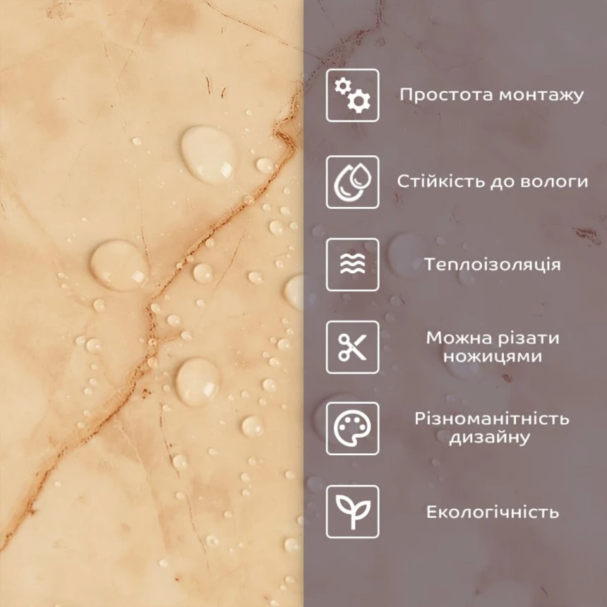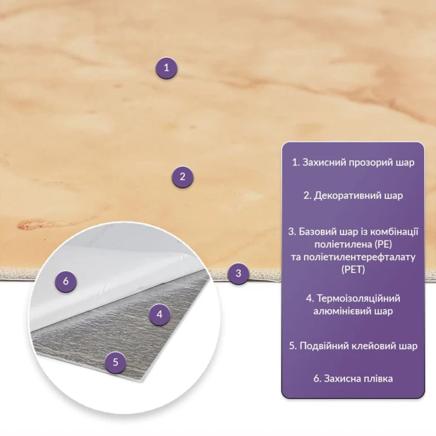 Самоклеюча стінова PET плитка Sticker wall - це сучасне та зручне рішення для стильного та швидкого оновлення інтер'єру. Вона ідеально підходить для створення оригінальних акцентів на стінах, додаючи текстури та глибини простору. Матеріал являє собою суміш двох полімерів - поліетилену (PE) та поліетилентерефталату (PET), яка забезпечує відмінні клеючі властивості та міцність. Розміри: - Плитка: 60 см х 30 см х 2 мм - Довжина: 60 см - Висота: 30 см - Товщина: 2 мм Вага: плитка 60 см х 30 см – 104 грам. Площа покриття: 60 см х 30 см х 2 мм – 0,18 кв. м, кількість на 1 кв. м – 6 одиниць. Фактура: рівна. Матеріал містить такі шари: 1. Прозорий шар захисту. 2. Декоративний шар із зображенням. 3. Основний шар, що складається з поєднання поліетилену (PE) та поліетилентерефталату (PET). 4. Термоізоляційний шар із алюмінію. 5. Подвійний шар клею. 6. Захисний папір. Температурний режим: -40 - +75 градусів. Застосування: Може бути використаний для різних внутрішніх оздоблювальних робіт, таких як декорування стін у житлових приміщеннях (наприклад, кухня, ванна кімната, вітальня, дитяча або спальня, вхідна зона) та комерційних приміщеннях (офіси, зони рецепції, магазини, салони краси, фітнес-центри) та громадські місця). Крім того, його можна використовувати для декорування меблів, дверей та інших рівних поверхонь. Властивості та переваги матеріалу: 1. Легкість і міцність: має легкість і міцність, що спрощує його транспортування, монтаж і забезпечує довгий термін служби. Він зручний в установці, може бути легко вирізаний ножицями чи монтажним ножем, не потребує додаткових матеріалів чи професійних навичок. Матеріал не розщеплюється, не надується і не деформується між смугами, з мінімальними втратами, що робить його ідеальним для стінових покриттів. 2. Водостійкість: цей матеріал стійкий до впливу вологи, пари та грибка, що робить його придатним для застосування в приміщеннях з високою вологістю, таких як ванні кімнати та кухні. Його можна використовувати для створення фартуха на кухні, проклеюючи плитки на відстані не менше ніж 20-25 см. 3. Ізоляція: плитка забезпечує звукову та теплоізоляцію завдяки наявності повітряних прошарків та додатковому алюмінієвому шару. 4. Антистатичний ефект: у складі покриття міститься антистатик, що запобігає накопиченню пилу на поверхні. 5. Різноманітність дизайну: плитки доступні у різноманітних колірних та структурних варіаціях, що дозволяє вибрати підходящий дизайн для вашого інтер'єру. 6. Імітація інших матеріалів: дизайн цієї плитки розроблений з урахуванням імітації інших матеріалів, таких як камінь або кераміка, пропонуючи естетично приємне рішення за доступною ціною. 7. Екологічна доброзичливість: матеріал може бути утилізований та перероблений, що робить його більш екологічно чистим варіантом у порівнянні з деякими іншими матеріалами. 8. Простота обслуговування: поверхня плитки легко очищається і не потребує особливого догляду. 9. Довгий термін служби: матеріал є міцним та стійким до зношування, що гарантує його тривалий термін служби. Монтаж: Крок 1 Перед початком встановлення переконайтеся, що поверхня, на яку ви збираєтесь встановлювати плитку, чиста, суха та рівна. Необхідно видалити всі сліди пилу, бруду чи олії з поверхні, за необхідності провести вирівнювання поверхні. Як плитка, так і поверхня повинні бути за кімнатної температури, щоб забезпечити
