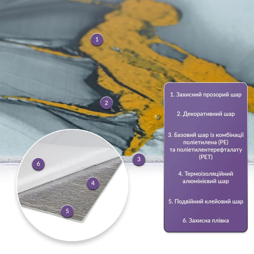 Самоклеюча стінова PET плитка Sticker wall - це сучасне та зручне рішення для стильного та швидкого оновлення інтер'єру. Вона ідеально підходить для створення оригінальних акцентів на стінах, додаючи текстури та глибини простору. Матеріал являє собою суміш двох полімерів - поліетилену (PE) та поліетилентерефталату (PET), яка забезпечує відмінні клеючі властивості та міцність. Розміри: - Плитка: 60 см х 30 см х 2 мм - Довжина: 60 см - Висота: 30 см - Товщина: 2 мм Вага: плитка 60 см х 30 см – 104 грам. Площа покриття: 60 см х 30 см х 2 мм – 0,18 кв. м, кількість на 1 кв. м – 6 одиниць. Фактура: рівна. Матеріал містить такі шари: 1. Прозорий шар захисту. 2. Декоративний шар із зображенням. 3. Основний шар, що складається з поєднання поліетилену (PE) та поліетилентерефталату (PET). 4. Термоізоляційний шар із алюмінію. 5. Подвійний шар клею. 6. Захисний папір. Температурний режим: -40 - +75 градусів. Застосування: Може бути використаний для різних внутрішніх оздоблювальних робіт, таких як декорування стін у житлових приміщеннях (наприклад, кухня, ванна кімната, вітальня, дитяча або спальня, вхідна зона) та комерційних приміщеннях (офіси, зони рецепції, магазини, салони краси, фітнес-центри) та громадські місця). Крім того, його можна використовувати для декорування меблів, дверей та інших рівних поверхонь. Властивості та переваги матеріалу: 1. Легкість і міцність: має легкість і міцність, що спрощує його транспортування, монтаж і забезпечує довгий термін служби. Він зручний в установці, може бути легко вирізаний ножицями чи монтажним ножем, не потребує додаткових матеріалів чи професійних навичок. Матеріал не розщеплюється, не надується і не деформується між смугами, з мінімальними втратами, що робить його ідеальним для стінових покриттів. 2. Водостійкість: цей матеріал стійкий до впливу вологи, пари та грибка, що робить його придатним для застосування в приміщеннях з високою вологістю, таких як ванні кімнати та кухні. Його можна використовувати для створення фартуха на кухні, проклеюючи плитки на відстані не менше ніж 20-25 см. 3. Ізоляція: плитка забезпечує звукову та теплоізоляцію завдяки наявності повітряних прошарків та додатковому алюмінієвому шару. 4. Антистатичний ефект: у складі покриття міститься антистатик, що запобігає накопиченню пилу на поверхні. 5. Різноманітність дизайну: плитки доступні у різноманітних колірних та структурних варіаціях, що дозволяє вибрати підходящий дизайн для вашого інтер'єру. 6. Імітація інших матеріалів: дизайн цієї плитки розроблений з урахуванням імітації інших матеріалів, таких як камінь або кераміка, пропонуючи естетично приємне рішення за доступною ціною. 7. Екологічна доброзичливість: матеріал може бути утилізований та перероблений, що робить його більш екологічно чистим варіантом у порівнянні з деякими іншими матеріалами. 8. Простота обслуговування: поверхня плитки легко очищається і не потребує особливого догляду. 9. Довгий термін служби: матеріал є міцним та стійким до зношування, що гарантує його тривалий термін служби. Монтаж: Крок 1 Перед початком встановлення переконайтеся, що поверхня, на яку ви збираєтесь встановлювати плитку, чиста, суха та рівна. Необхідно видалити всі сліди пилу, бруду чи олії з поверхні, за необхідності провести вирівнювання поверхні. Як плитка, так і поверхня повинні бути за кімнатної температури, щоб забезпечити