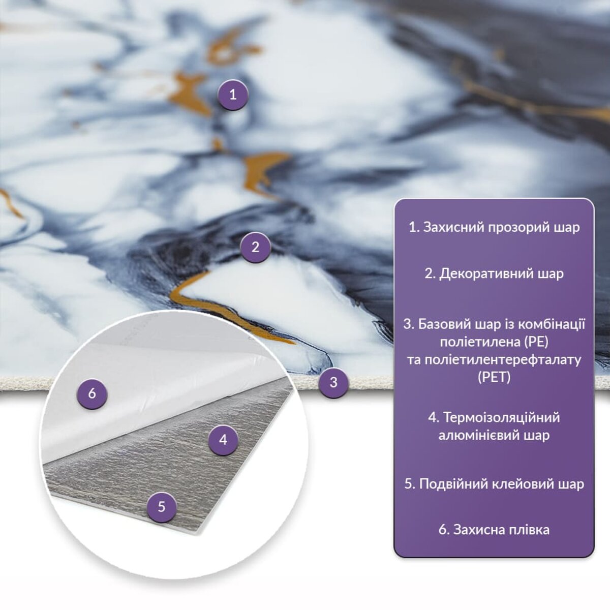 PET-плитка — це сучасне рішення для внутрішнього оздоблення, що поєднує в собі стиль, простоту монтажу та високу зносостійкість. Вона ідеально підходить для оформлення стін у найрізноманітніших приміщеннях — від житлових просторів до комерційних об’єктів. Використовуйте її на кухнях, у ванних кімнатах, вітальнях, дитячих, спальнях, а також в офісах, зонах рецепції, салонах краси, магазинах, фітнес-центрах та інших громадських місцях. Універсальність матеріалу дозволяє застосовувати PET-плитку не лише на стінах, а й на меблях, дверях та будь-яких інших рівних поверхнях. Завдяки самоклейкій основі монтаж не потребує спеціальних інструментів і займає мінімум часу. Кожен дизайн PET-плитки ретельно розроблений для точної імітації натуральних матеріалів — каменю, кераміки та інших популярних текстур. Це дозволяє створити стильний і гармонійний інтер’єр без зайвих витрат. Матеріал являє собою суміш двох полімерів - поліетилену (PE) та поліетилентерефталату (PET), яка забезпечує відмінні клеючі властивості та міцність. Розміри: - Рулон: 120 см х 300 см х 2 мм - Довжина: 300 см - Ширина: 120 см - Товщина: 2 мм Площа покриття: 120 см х 300 см х 2 мм – 3,6 кв. м. Фактура: рівна. Матеріал містить такі шари: 1. Прозорий шар захисту. 2. Декоративний шар із зображенням. 3. Основний шар, що складається з поєднання поліетилену (PE) та поліетилентерефталату (PET). 4. Термоізоляційний шар із алюмінію. 5. Подвійний шар клею. 6. Захисний папір. Температурний режим: -40 - +75 градусів. Застосування: Може бути використаний для різних внутрішніх оздоблювальних робіт, таких як декорування стін у житлових приміщеннях (наприклад, кухня, ванна кімната, вітальня, дитяча або спальня, вхідна зона) та комерційних приміщеннях (офіси, зони рецепції, магазини, салони краси, фітнес-центри) та громадські місця). Крім того, його можна використовувати для декорування меблів, дверей та інших рівних поверхонь. Властивості та переваги матеріалу: 1. Легкість і міцність: має легкість і міцність, що спрощує його транспортування, монтаж і забезпечує довгий термін служби. Він зручний в установці, може бути легко вирізаний ножицями чи монтажним ножем, не потребує додаткових матеріалів чи професійних навичок. Матеріал не розщеплюється, не надується і не деформується між смугами, з мінімальними втратами, що робить його ідеальним для стінових покриттів. 2. Водостійкість: цей матеріал стійкий до впливу вологи, пари та грибка, що робить його придатним для застосування в приміщеннях з високою вологістю, таких як ванні кімнати та кухні. Його можна використовувати для створення фартуха на кухні, проклеюючи плитки на відстані не менше ніж 20-25 см. 3. Ізоляція: плитка забезпечує звукову та теплоізоляцію завдяки наявності повітряних прошарків та додатковому алюмінієвому шару. 4. Антистатичний ефект: у складі покриття міститься антистатик, що запобігає накопиченню пилу на поверхні. 5. Різноманітність дизайну: плитки доступні у різноманітних колірних та структурних варіаціях, що дозволяє вибрати підходящий дизайн для вашого інтер'єру. 6. Імітація інших матеріалів: дизайн цієї плитки розроблений з урахуванням імітації інших матеріалів, таких як камінь або кераміка, пропонуючи естетично приємне рішення за доступною ціною. 7. Екологічна доброзичливість: матеріал може бути утилізований та перероблений, що робить його більш еколо