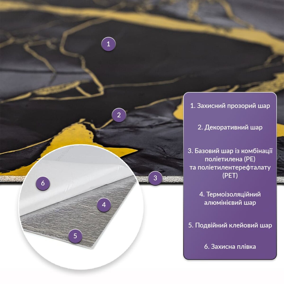 PET-плитка — це сучасне рішення для внутрішнього оздоблення, що поєднує в собі стиль, простоту монтажу та високу зносостійкість. Вона ідеально підходить для оформлення стін у найрізноманітніших приміщеннях — від житлових просторів до комерційних об’єктів. Використовуйте її на кухнях, у ванних кімнатах, вітальнях, дитячих, спальнях, а також в офісах, зонах рецепції, салонах краси, магазинах, фітнес-центрах та інших громадських місцях. Універсальність матеріалу дозволяє застосовувати PET-плитку не лише на стінах, а й на меблях, дверях та будь-яких інших рівних поверхнях. Завдяки самоклейкій основі монтаж не потребує спеціальних інструментів і займає мінімум часу. Кожен дизайн PET-плитки ретельно розроблений для точної імітації натуральних матеріалів — каменю, кераміки та інших популярних текстур. Це дозволяє створити стильний і гармонійний інтер’єр без зайвих витрат. Матеріал являє собою суміш двох полімерів - поліетилену (PE) та поліетилентерефталату (PET), яка забезпечує відмінні клеючі властивості та міцність. Розміри: - Рулон: 120 см х 300 см х 2 мм - Довжина: 300 см - Ширина: 120 см - Товщина: 2 мм Площа покриття: 120 см х 300 см х 2 мм – 3,6 кв. м. Фактура: рівна. Матеріал містить такі шари: 1. Прозорий шар захисту. 2. Декоративний шар із зображенням. 3. Основний шар, що складається з поєднання поліетилену (PE) та поліетилентерефталату (PET). 4. Термоізоляційний шар із алюмінію. 5. Подвійний шар клею. 6. Захисний папір. Температурний режим: -40 - +75 градусів. Застосування: Може бути використаний для різних внутрішніх оздоблювальних робіт, таких як декорування стін у житлових приміщеннях (наприклад, кухня, ванна кімната, вітальня, дитяча або спальня, вхідна зона) та комерційних приміщеннях (офіси, зони рецепції, магазини, салони краси, фітнес-центри) та громадські місця). Крім того, його можна використовувати для декорування меблів, дверей та інших рівних поверхонь. Властивості та переваги матеріалу: 1. Легкість і міцність: має легкість і міцність, що спрощує його транспортування, монтаж і забезпечує довгий термін служби. Він зручний в установці, може бути легко вирізаний ножицями чи монтажним ножем, не потребує додаткових матеріалів чи професійних навичок. Матеріал не розщеплюється, не надується і не деформується між смугами, з мінімальними втратами, що робить його ідеальним для стінових покриттів. 2. Водостійкість: цей матеріал стійкий до впливу вологи, пари та грибка, що робить його придатним для застосування в приміщеннях з високою вологістю, таких як ванні кімнати та кухні. Його можна використовувати для створення фартуха на кухні, проклеюючи плитки на відстані не менше ніж 20-25 см. 3. Ізоляція: плитка забезпечує звукову та теплоізоляцію завдяки наявності повітряних прошарків та додатковому алюмінієвому шару. 4. Антистатичний ефект: у складі покриття міститься антистатик, що запобігає накопиченню пилу на поверхні. 5. Різноманітність дизайну: плитки доступні у різноманітних колірних та структурних варіаціях, що дозволяє вибрати підходящий дизайн для вашого інтер'єру. 6. Імітація інших матеріалів: дизайн цієї плитки розроблений з урахуванням імітації інших матеріалів, таких як камінь або кераміка, пропонуючи естетично приємне рішення за доступною ціною. 7. Екологічна доброзичливість: матеріал може бути утилізований та перероблений, що робить його більш еколо