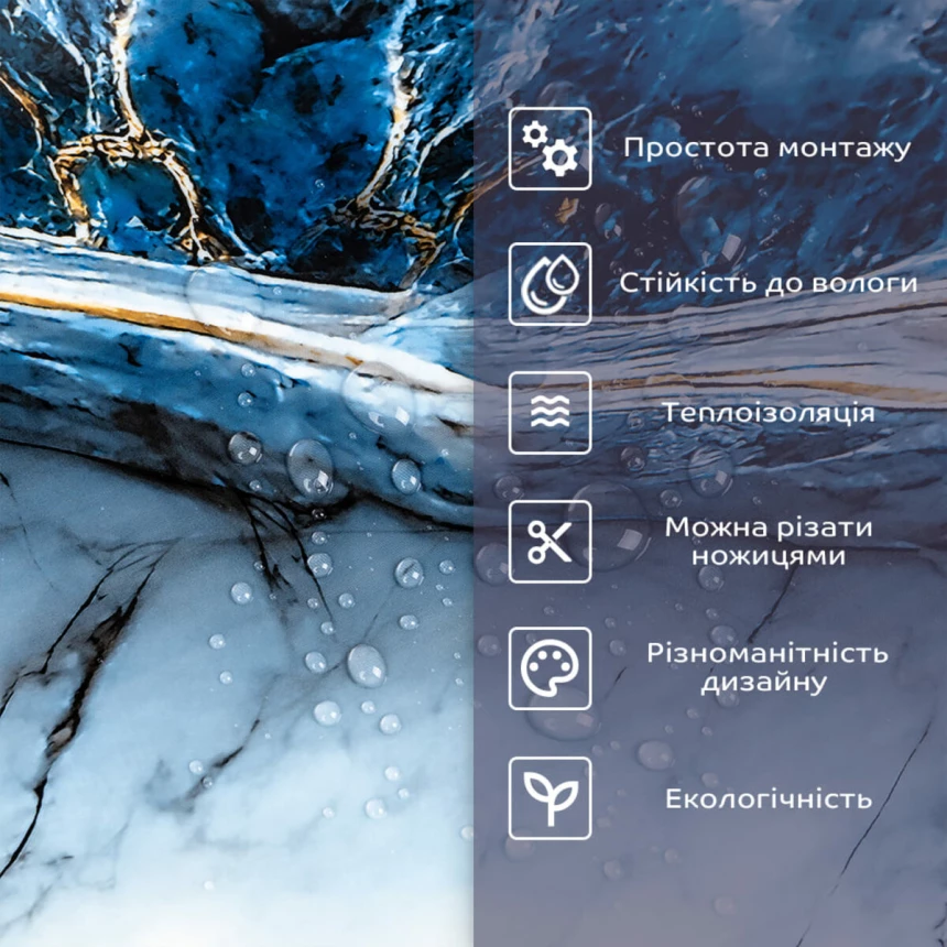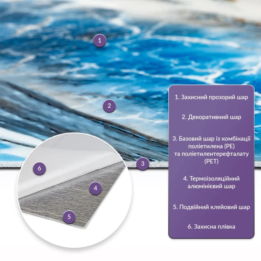 PET-плитка — це сучасне рішення для внутрішнього оздоблення, що поєднує в собі стиль, простоту монтажу та високу зносостійкість. Вона ідеально підходить для оформлення стін у найрізноманітніших приміщеннях — від житлових просторів до комерційних об’єктів. Використовуйте її на кухнях, у ванних кімнатах, вітальнях, дитячих, спальнях, а також в офісах, зонах рецепції, салонах краси, магазинах, фітнес-центрах та інших громадських місцях. Універсальність матеріалу дозволяє застосовувати PET-плитку не лише на стінах, а й на меблях, дверях та будь-яких інших рівних поверхнях. Завдяки самоклейкій основі монтаж не потребує спеціальних інструментів і займає мінімум часу. Кожен дизайн PET-плитки ретельно розроблений для точної імітації натуральних матеріалів — каменю, кераміки та інших популярних текстур. Це дозволяє створити стильний і гармонійний інтер’єр без зайвих витрат. Матеріал являє собою суміш двох полімерів - поліетилену (PE) та поліетилентерефталату (PET), яка забезпечує відмінні клеючі властивості та міцність. Розміри: - Рулон: 60 см х 300 см х 2 мм - Довжина: 300 см - Ширина: 60 см - Товщина: 2 мм Вага: рулон 3 метри – 900 грам. Площа покриття: 60 см х 300 см х 2 мм – 1,8 кв. м, кількість на 1 кв. м – 1 одиниця. Фактура: рівна. Матеріал містить такі шари: 1. Прозорий шар захисту. 2. Декоративний шар із зображенням. 3. Основний шар, що складається з поєднання поліетилену (PE) та поліетилентерефталату (PET). 4. Термоізоляційний шар із алюмінію. 5. Подвійний шар клею. 6. Захисний папір. Температурний режим: -40 - +75 градусів. Застосування: Може бути використаний для різних внутрішніх оздоблювальних робіт, таких як декорування стін у житлових приміщеннях (наприклад, кухня, ванна кімната, вітальня, дитяча або спальня, вхідна зона) та комерційних приміщеннях (офіси, зони рецепції, магазини, салони краси, фітнес-центри) та громадські місця). Крім того, його можна використовувати для декорування меблів, дверей та інших рівних поверхонь. Властивості та переваги матеріалу: 1. Легкість і міцність: має легкість і міцність, що спрощує його транспортування, монтаж і забезпечує довгий термін служби. Він зручний в установці, може бути легко вирізаний ножицями чи монтажним ножем, не потребує додаткових матеріалів чи професійних навичок. Матеріал не розщеплюється, не надується і не деформується між смугами, з мінімальними втратами, що робить його ідеальним для стінових покриттів. 2. Водостійкість: цей матеріал стійкий до впливу вологи, пари та грибка, що робить його придатним для застосування в приміщеннях з високою вологістю, таких як ванні кімнати та кухні. Його можна використовувати для створення фартуха на кухні, проклеюючи плитки на відстані не менше ніж 20-25 см. 3. Ізоляція: плитка забезпечує звукову та теплоізоляцію завдяки наявності повітряних прошарків та додатковому алюмінієвому шару. 4. Антистатичний ефект: у складі покриття міститься антистатик, що запобігає накопиченню пилу на поверхні. 5. Різноманітність дизайну: плитки доступні у різноманітних колірних та структурних варіаціях, що дозволяє вибрати підходящий дизайн для вашого інтер'єру. 6. Імітація інших матеріалів: дизайн цієї плитки розроблений з урахуванням імітації інших матеріалів, таких як камінь або кераміка, пропонуючи естетично приємне рішення за доступною ціною. 7. Екологічна доброзичливість: матеріал може бут