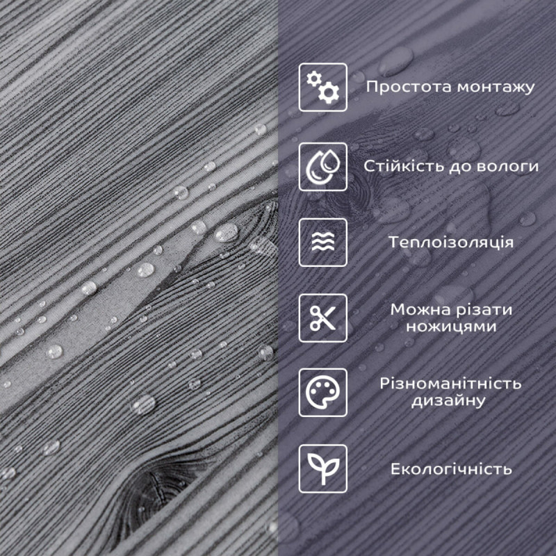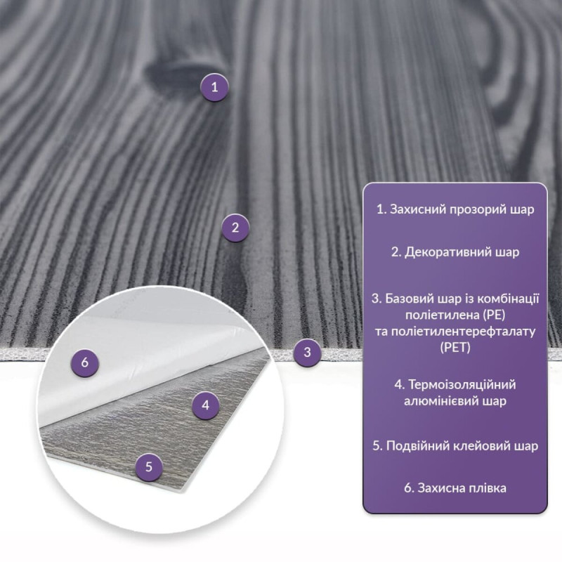 PET-плитка — це сучасне рішення для внутрішнього оздоблення, що поєднує в собі стиль, простоту монтажу та високу зносостійкість. Вона ідеально підходить для оформлення стін у найрізноманітніших приміщеннях — від житлових просторів до комерційних об’єктів. Використовуйте її на кухнях, у ванних кімнатах, вітальнях, дитячих, спальнях, а також в офісах, зонах рецепції, салонах краси, магазинах, фітнес-центрах та інших громадських місцях. Універсальність матеріалу дозволяє застосовувати PET-плитку не лише на стінах, а й на меблях, дверях та будь-яких інших рівних поверхнях. Завдяки самоклейкій основі монтаж не потребує спеціальних інструментів і займає мінімум часу. Кожен дизайн PET-плитки ретельно розроблений для точної імітації натуральних матеріалів — каменю, кераміки та інших популярних текстур. Це дозволяє створити стильний і гармонійний інтер’єр без зайвих витрат. Матеріал являє собою суміш двох полімерів - поліетилену (PE) та поліетилентерефталату (PET), яка забезпечує відмінні клеючі властивості та міцність. Розміри: - Рулон: 60 см х 300 см х 2 мм - Довжина: 300 см - Ширина: 60 см - Товщина: 2 мм Вага: рулон 3 метри – 900 грам. Площа покриття: 60 см х 300 см х 2 мм – 1,8 кв. м, кількість на 1 кв. м – 1 одиниця. Фактура: рівна. Матеріал містить такі шари: 1. Прозорий шар захисту. 2. Декоративний шар із зображенням. 3. Основний шар, що складається з поєднання поліетилену (PE) та поліетилентерефталату (PET). 4. Термоізоляційний шар із алюмінію. 5. Подвійний шар клею. 6. Захисний папір. Температурний режим: -40 - +75 градусів. Застосування: Може бути використаний для різних внутрішніх оздоблювальних робіт, таких як декорування стін у житлових приміщеннях (наприклад, кухня, ванна кімната, вітальня, дитяча або спальня, вхідна зона) та комерційних приміщеннях (офіси, зони рецепції, магазини, салони краси, фітнес-центри) та громадські місця). Крім того, його можна використовувати для декорування меблів, дверей та інших рівних поверхонь. Властивості та переваги матеріалу: 1. Легкість і міцність: має легкість і міцність, що спрощує його транспортування, монтаж і забезпечує довгий термін служби. Він зручний в установці, може бути легко вирізаний ножицями чи монтажним ножем, не потребує додаткових матеріалів чи професійних навичок. Матеріал не розщеплюється, не надується і не деформується між смугами, з мінімальними втратами, що робить його ідеальним для стінових покриттів. 2. Водостійкість: цей матеріал стійкий до впливу вологи, пари та грибка, що робить його придатним для застосування в приміщеннях з високою вологістю, таких як ванні кімнати та кухні. Його можна використовувати для створення фартуха на кухні, проклеюючи плитки на відстані не менше ніж 20-25 см. 3. Ізоляція: плитка забезпечує звукову та теплоізоляцію завдяки наявності повітряних прошарків та додатковому алюмінієвому шару. 4. Антистатичний ефект: у складі покриття міститься антистатик, що запобігає накопиченню пилу на поверхні. 5. Різноманітність дизайну: плитки доступні у різноманітних колірних та структурних варіаціях, що дозволяє вибрати підходящий дизайн для вашого інтер'єру. 6. Імітація інших матеріалів: дизайн цієї плитки розроблений з урахуванням імітації інших матеріалів, таких як камінь або кераміка, пропонуючи естетично приємне рішення за доступною ціною. 7. Екологічна доброзичливість: матеріал може бут