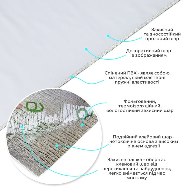 Самоклеюча вінілова плитка у рулоні Sticker wall 0,6*3m*2мм Мат SW-00002032 - це декоративний матеріал для внутрішнього оздоблення, який завдяки клейовій основі легко встановлюється. Плитка доступна у різних дизайнах, що імітують натуральні матеріали, і підходить для багатьох інтер'єрних рішень. Матеріал: ПВХ. Розміри: 0,6*3м*2мм. Площа покриття: 1,8 кв. м (600 х 3000 мм). Фактура: гладка з імітацією природних матеріалів. Поверхня глянсова або трохи матова. Плитка складається з наступних шарів: 1. Полімерний шар: захищає від потертостей та механічних пошкоджень, забезпечує довговічність та УФ захист, запобігаючи вигоранню та зберігаючи колір. 2. Декоративний шар: плівка з високоякісним кольоровим друком, що імітує фактуру природних матеріалів. 3. Основний шар з ПВХ: спінений полівінілхлорид, стійкий до хімічних речовин, пружний та ударостійкий завдяки аморфній будові та добавкам стабілізаторів та пом'якшувачів. 4. Фольгований шар: відбиває теплові хвилі, покращуючи теплоізоляцію приміщення. 5. Клейовий шар: нетоксична основа з високою адгезією. 6. Захисна плівка: оберігає клейовий шар від пересихання та забруднення, легко знімається під час монтажу. Температурні умови: Під впливом найвищих температур матеріал може деформуватися. У кухонній зоні монтаж плитки слід проводити на відстані 30-50 см від джерела вогню. Застосування: Внутрішнє оздоблення: облицювання стін у різних типах житлових приміщень (кухні, ванні кімнати, вітальні, дитячі або спальні, вітальні) та комерційних об'єктів (офіси, ресепшн-зони, магазини, салони краси або фітнес-центри, громадські місця, майстерні), а також меблів, дверей та інших гладких поверхонь. Особливості та переваги матеріалу: - Легке укладання: самоклеюча, без клею, стик у стик, ріжеться ножицями, не розходиться, не деформується, мінімальний обріз (1%). - Практичність: вологостійка, стійка до пари, плісняви, підходить для кухні та ванної кімнати, міцна, зносостійка. - Естетика: великий вибір дизайнів, імітація натуральних матеріалів, вибір під будь-який стиль, комбінується за кольором. - Догляд: легке очищення, не вимагає спецзасобів. - Додатково: звуко- та теплоізоляція, екологічність. Розрахунок необхідної кількості матеріалу: Для розрахунку необхідної кількості матеріалу спочатку виміряйте довжину та висоту поверхні, яку ви збираєтеся обклеїти. Потім помножте довжину на висоту для кожної поверхні в метрах, щоб отримати площу. Наприклад, якщо довжина стіни становить 4,35 метра, а висота 2,8 метра, то площа дорівнюватиме 12,18 квадратних метрів (4,35 * 2,8 = 12,18). Після цього виберіть кількість рулонів, необхідних для покриття цієї площі. Розділіть отриману площу на площу одного рулону (600*3000 = 1,8), округливши результат у велику сторону. Наприклад, при розподілі 12,18 на 1,8 виходить 6,76, що округляється до 7 рулонів. Врахуйте, що в процесі монтажу можуть виникнути відходи через підрізування рулонів, тому рекомендується додати до розрахунку щонайменше 1 запасний рулон. Монтаж: Самоклеючу вінілову плитку у рулоні можна приклеїти на різні поверхні, такі як старий лінолеум, кахель, плитку, паркет, ламінат, скло, фарбу, ґрунтований бетон з невеликими нерівностями і дрібними вибоїнами, без необхідності особливої підготовки поверхні. Однак, якщо поверхня покрита побілкою, необхідно заздалегідь очистити її. Перед монтажем приміщення має бути сухим, а тем