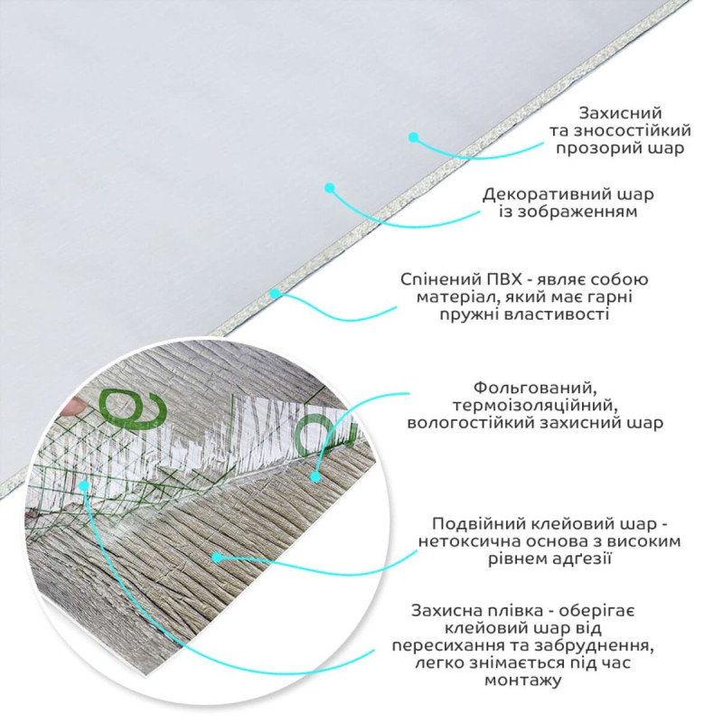 Самоклеюча вінілова плитка у рулоні Sticker wall 0,6*3m*2мм Мат SW-00002057 - це декоративний матеріал для внутрішнього оздоблення, який завдяки клейовій основі легко встановлюється. Плитка доступна у різних дизайнах, що імітують натуральні матеріали, і підходить для багатьох інтер'єрних рішень. Матеріал: ПВХ. Розміри: 0,6*3м*2мм. Площа покриття: 1,8 кв. м (600 х 3000 мм). Фактура: гладка з імітацією природних матеріалів. Поверхня глянсова або трохи матова. Плитка складається з наступних шарів: 1. Полімерний шар: захищає від потертостей та механічних пошкоджень, забезпечує довговічність та УФ захист, запобігаючи вигоранню та зберігаючи колір. 2. Декоративний шар: плівка з високоякісним кольоровим друком, що імітує фактуру природних матеріалів. 3. Основний шар з ПВХ: спінений полівінілхлорид, стійкий до хімічних речовин, пружний та ударостійкий завдяки аморфній будові та добавкам стабілізаторів та пом'якшувачів. 4. Фольгований шар: відбиває теплові хвилі, покращуючи теплоізоляцію приміщення. 5. Клейовий шар: нетоксична основа з високою адгезією. 6. Захисна плівка: оберігає клейовий шар від пересихання та забруднення, легко знімається під час монтажу. Температурні умови: Під впливом найвищих температур матеріал може деформуватися. У кухонній зоні монтаж плитки слід проводити на відстані 30-50 см від джерела вогню. Застосування: Внутрішнє оздоблення: облицювання стін у різних типах житлових приміщень (кухні, ванні кімнати, вітальні, дитячі або спальні, вітальні) та комерційних об'єктів (офіси, ресепшн-зони, магазини, салони краси або фітнес-центри, громадські місця, майстерні), а також меблів, дверей та інших гладких поверхонь. Особливості та переваги матеріалу: - Легке укладання: самоклеюча, без клею, стик у стик, ріжеться ножицями, не розходиться, не деформується, мінімальний обріз (1%). - Практичність: вологостійка, стійка до пари, плісняви, підходить для кухні та ванної кімнати, міцна, зносостійка. - Естетика: великий вибір дизайнів, імітація натуральних матеріалів, вибір під будь-який стиль, комбінується за кольором. - Догляд: легке очищення, не вимагає спецзасобів. - Додатково: звуко- та теплоізоляція, екологічність. Розрахунок необхідної кількості матеріалу: Для розрахунку необхідної кількості матеріалу спочатку виміряйте довжину та висоту поверхні, яку ви збираєтеся обклеїти. Потім помножте довжину на висоту для кожної поверхні в метрах, щоб отримати площу. Наприклад, якщо довжина стіни становить 4,35 метра, а висота 2,8 метра, то площа дорівнюватиме 12,18 квадратних метрів (4,35 * 2,8 = 12,18). Після цього виберіть кількість рулонів, необхідних для покриття цієї площі. Розділіть отриману площу на площу одного рулону (600*3000 = 1,8), округливши результат у велику сторону. Наприклад, при розподілі 12,18 на 1,8 виходить 6,76, що округляється до 7 рулонів. Врахуйте, що в процесі монтажу можуть виникнути відходи через підрізування рулонів, тому рекомендується додати до розрахунку щонайменше 1 запасний рулон. Монтаж: Самоклеючу вінілову плитку у рулоні можна приклеїти на різні поверхні, такі як старий лінолеум, кахель, плитку, паркет, ламінат, скло, фарбу, ґрунтований бетон з невеликими нерівностями і дрібними вибоїнами, без необхідності особливої підготовки поверхні. Однак, якщо поверхня покрита побілкою, необхідно заздалегідь очистити її. Перед монтажем приміщення має бути сухим, а тем