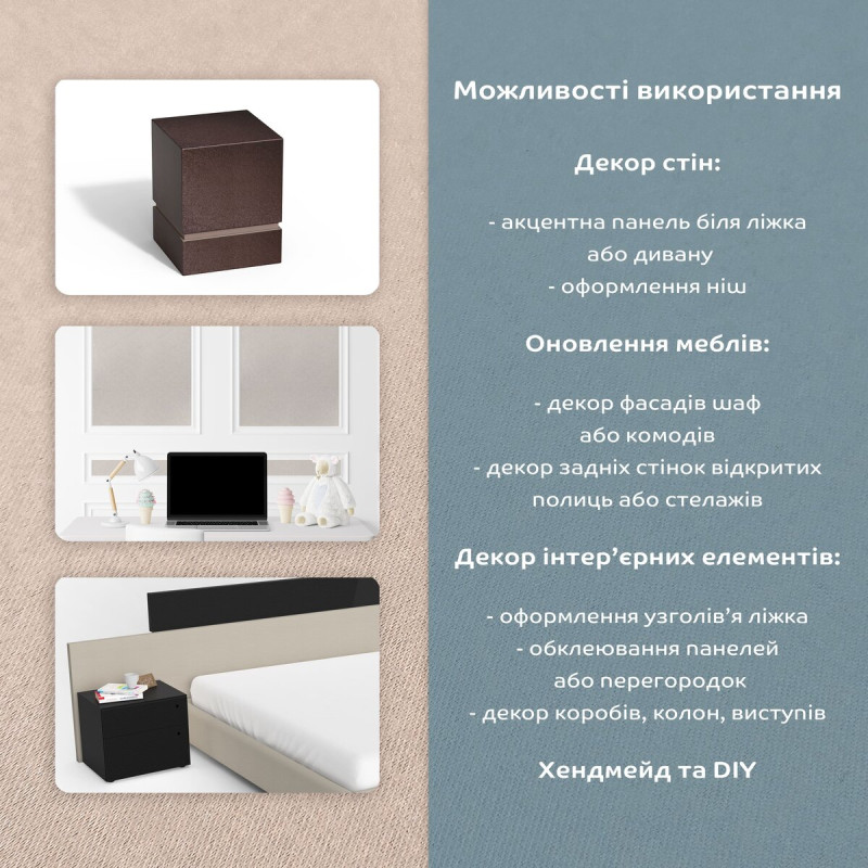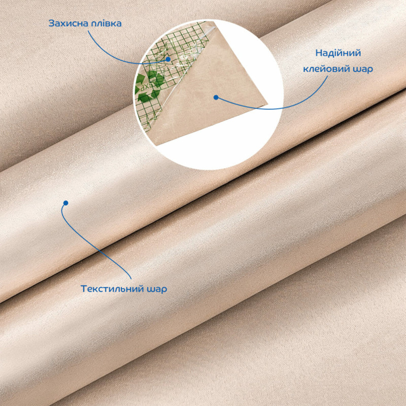 Самоклейний сатин — це декоративне покриття з текстильною поверхнею, яке поєднує вишукану естетику тканини та зручність монтажу. Верхній шар має легкий благородний блиск і м’який перелив, що створює ефект сатинової тканини та надає простору відчуття преміальності. Матеріал легко наноситься завдяки надійній клейовій основі: він міцно фіксується на поверхні без необхідності використовувати додаткові інструменти чи витратні матеріали. У результаті ви отримуєте акуратне, рівне покриття з естетичним зовнішнім виглядом. Структура матеріалу 1. Текстильний шар: декоративна поверхня з м’якою, приємною на дотик текстурою та делікатним блиском. Формує зовнішній вигляд покриття та створює ефект дорогої тканини. 2. Клейовий шар: високоякісна клейова основа з відмінною адгезією. Забезпечує щільне прилягання до поверхні та довговічну фіксацію без відклеювання. 3. Захисна плівка з розміткою: захищає клейовий шар від забруднень і пересихання. Зручна розмітка дозволяє швидко й точно нарізати матеріал без додаткових вимірювань. Сфера застосування Самоклейний сатин рекомендується використовувати на рівних і гладких поверхнях, оскільки текстильна структура не приховує нерівності. Ідеально підходить для: • декоративного оздоблення стін • оформлення зон біля ліжка або дивана • створення узголів’я • декору ніш, колон, коробів і перегородок • оновлення фасадів меблів (шафи, комоди) • оформлення задніх стінок стелажів і полиць • декоративних елементів інтер’єру • подарункового оформлення та handmade-виробів Переваги • Преміальний зовнішній вигляд: сатинова поверхня надає інтер’єру глибину кольору та ефект дорогої тканини. • Надійна фіксація: клейовий шар забезпечує міцне зчеплення та довговічність покриття. • Ідеально рівне покриття: після монтажу матеріал вирівнюється та виглядає гладким, без дефектів. • Зручність у роботі: розмітка на захисній плівці спрощує розкрій і економить час. Інструкція з монтажу 1. Наносити лише на чисту, суху та рівну поверхню. 2. Розгладжувати матеріал пластиковим або гумовим шпателем. 3. Клеїти поступово, знімаючи захисну плівку частинами. 4. Уникати контакту клейових сторін між собою. Самоклейний сатин — це простий спосіб змінити простір, додавши йому елегантності, затишку та сучасного стилю без складного ремонту.Характеристики
