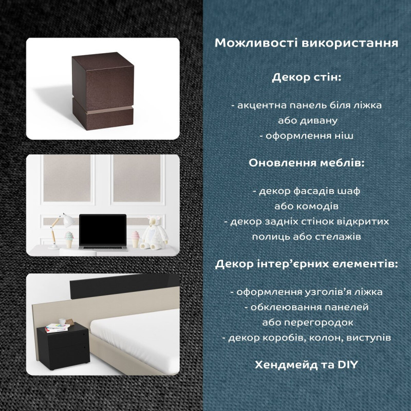 Самоклейний сатин — це декоративне покриття з текстильною поверхнею, яке поєднує вишукану естетику тканини та зручність монтажу. Верхній шар має легкий благородний блиск і м’який перелив, що створює ефект сатинової тканини та надає простору відчуття преміальності. Матеріал легко наноситься завдяки надійній клейовій основі: він міцно фіксується на поверхні без необхідності використовувати додаткові інструменти чи витратні матеріали. У результаті ви отримуєте акуратне, рівне покриття з естетичним зовнішнім виглядом. Структура матеріалу 1. Текстильний шар: декоративна поверхня з м’якою, приємною на дотик текстурою та делікатним блиском. Формує зовнішній вигляд покриття та створює ефект дорогої тканини. 2. Клейовий шар: високоякісна клейова основа з відмінною адгезією. Забезпечує щільне прилягання до поверхні та довговічну фіксацію без відклеювання. 3. Захисна плівка з розміткою: захищає клейовий шар від забруднень і пересихання. Зручна розмітка дозволяє швидко й точно нарізати матеріал без додаткових вимірювань. Сфера застосування Самоклейний сатин рекомендується використовувати на рівних і гладких поверхнях, оскільки текстильна структура не приховує нерівності. Ідеально підходить для: • декоративного оздоблення стін • оформлення зон біля ліжка або дивана • створення узголів’я • декору ніш, колон, коробів і перегородок • оновлення фасадів меблів (шафи, комоди) • оформлення задніх стінок стелажів і полиць • декоративних елементів інтер’єру • подарункового оформлення та handmade-виробів Переваги • Преміальний зовнішній вигляд: сатинова поверхня надає інтер’єру глибину кольору та ефект дорогої тканини. • Надійна фіксація: клейовий шар забезпечує міцне зчеплення та довговічність покриття. • Ідеально рівне покриття: після монтажу матеріал вирівнюється та виглядає гладким, без дефектів. • Зручність у роботі: розмітка на захисній плівці спрощує розкрій і економить час. Інструкція з монтажу 1. Наносити лише на чисту, суху та рівну поверхню. 2. Розгладжувати матеріал пластиковим або гумовим шпателем. 3. Клеїти поступово, знімаючи захисну плівку частинами. 4. Уникати контакту клейових сторін між собою. Самоклейний сатин — це простий спосіб змінити простір, додавши йому елегантності, затишку та сучасного стилю без складного ремонту.Характеристики