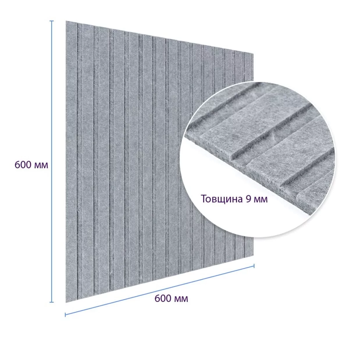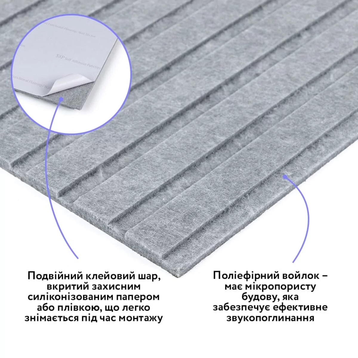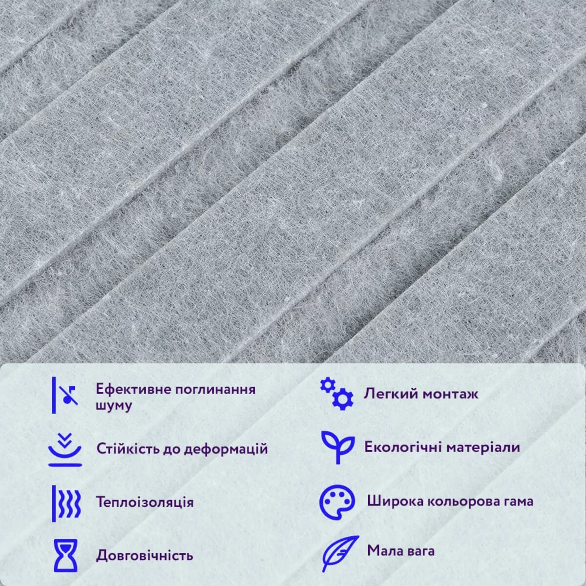 Самоклеючі звукоізоляційні панелі — це сучасне рішення для зменшення рівня шуму та покращення акустики у житлових і комерційних приміщеннях. Вони поєднують функціональність професійних акустичних матеріалів із привабливим декоративним дизайном. Основу панелей становить пресований поліефірний войлок — легкий, міцний та стійкий до деформацій матеріал, який ефективно поглинає звук і додатково зберігає тепло. Завдяки самоклеючому шару монтаж не потребує інструментів, свердління чи спеціальних навичок — панелі легко кріпляться на рівну поверхню за лічені хвилини. Однотонна матова поверхня з виразною волокнистою текстурою та 3D-ефектом (під рейку, цеглу або геометричні форми) робить панелі не лише практичним, а й стильним елементом інтер’єру. Ідеальне рішення, якщо ви хочете: • зменшити шум від сусідів або вулиці • покращити звучання музики чи голосу в приміщенні • швидко оновити інтер’єр без ремонту • поєднати практичність та естетику Розміри: 600х600х9мм. Шари матеріалу та конструкція Поліефірний войлок Поліефірний войлок — це сучасний нетканий матеріал, виготовлений зі 100% поліефірного волокна методом механічного пресування з подальшим термічним скріпленням. У процесі виробництва волокна щільно переплітаються між собою без застосування клеїв, утворюючи однорідну, стабільну структуру з високою щільністю. Мікропориста будова матеріалу забезпечує ефективне звукопоглинання: акустичні хвилі розсіюються всередині волокнистої матриці, що знижує рівень шуму та мінімізує відлуння в приміщенні. Войлок вирізняється підвищеною механічною міцністю, формостійкістю та стійкістю до деформацій навіть за тривалої експлуатації. Подвійний клейовий шар Зі зворотного боку панелі розміщено нетоксичний клейовий шар з високими адгезійними властивостями, який забезпечує надійне кріплення до різних типів поверхонь. Клей не має запаху, безпечний для використання в житлових і робочих приміщеннях та не потребує додаткових монтажних матеріалів. Захисний шар Клейову основу захищає силіконізований папір або плівка, яка запобігає пересиханню та забрудненню. Під час монтажу захисний шар легко знімається, що робить установку швидкою та зручною. Основні переваги звукоізоляційних панелей: 1. Ефективне поглинання шуму Щільна волокниста структура панелей активно поглинає звукові хвилі, зменшуючи рівень шуму та ехо. Це створює комфортну акустичну атмосферу для роботи, відпочинку, навчання або розваг. 2. Додаткова теплоізоляція Неоднорідна структура поліефірного войлоку утримує тепло, допомагаючи підтримувати приємний мікроклімат у приміщенні та зменшувати тепловтрати. 3. Простий і швидкий монтаж Завдяки самоклеючому шару панелі легко встановлюються без інструментів, свердління чи клею. За потреби окремі елементи можна швидко замінити без демонтажу всієї поверхні та масштабного ремонту. 4. Широкі дизайнерські можливості Панелі легко комбінуються за кольорами, формами та фактурами. Їх можна використовувати на стінах, стелях або як функціональну декоративну поверхню, реалізуючи індивідуальні дизайнерські рішення для будь-якого інтер’єру. 5. Екологічна безпека Матеріали не містять токсичних добавок, не мають запаху та придатні до переробки. Панелі безпечні для використання в житлових, робочих і дитячих приміщеннях. 6. Стійкість 